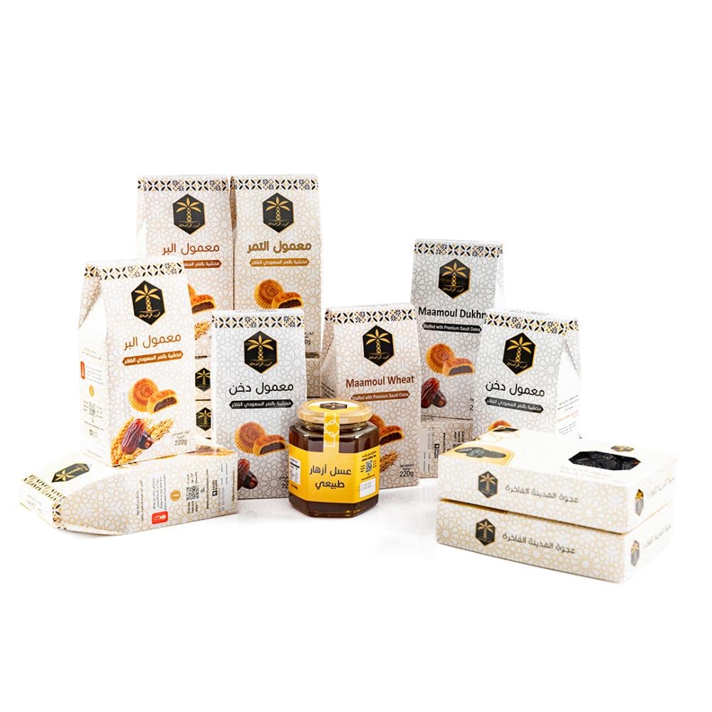 محتوى العرض: 2 علبة عجوة + 9 علب معمول (البر، الدخن، والدقيق) + عبوة عسل من اختيارك.
